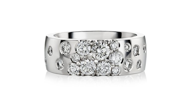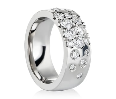 Tarsi išbarstyti žiedo paviršiuje, tačiau iš tiesų kievienas turintis tikslą ir paskirtį. Tai deimantų šokis baltame aukse.