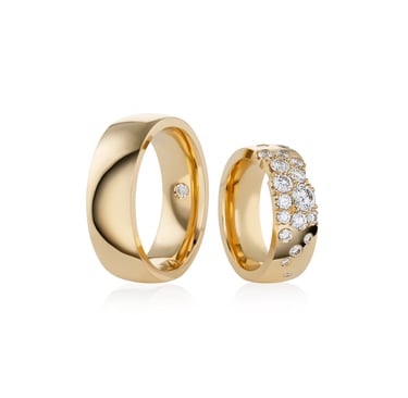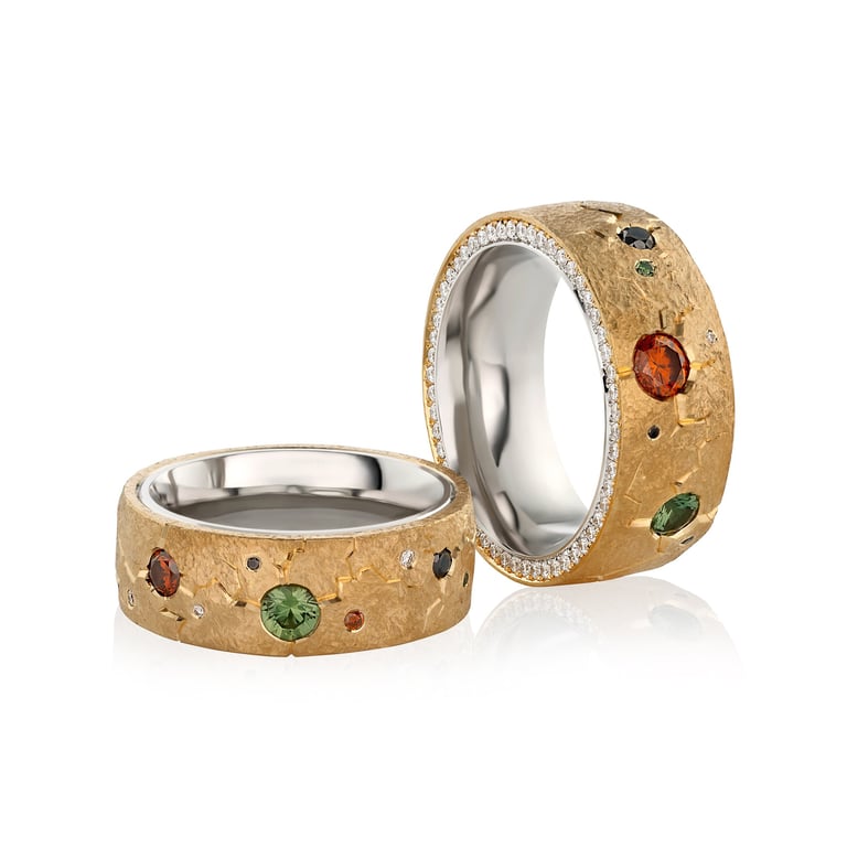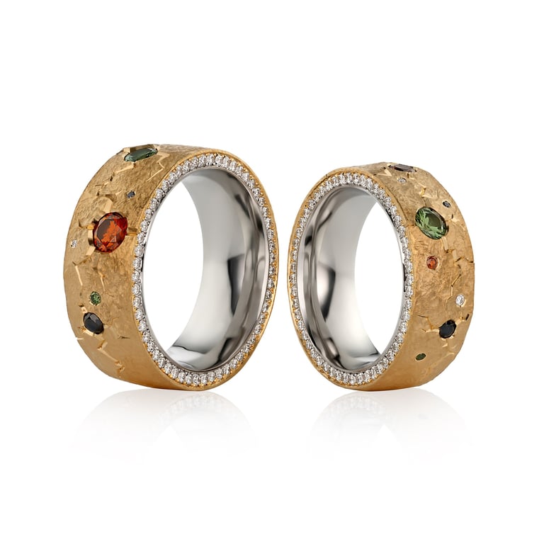 Šie vestuviniai žiedai savyje slepia žinutę, kuria įžvelgia ne kiekvienas. Tarsi sutrūkinėjusi žemė, kuri dovanoja mums savo turtus, tarsi jūra ir jos purslai, tarsi gilus dangus ir žvaigždynai.